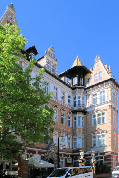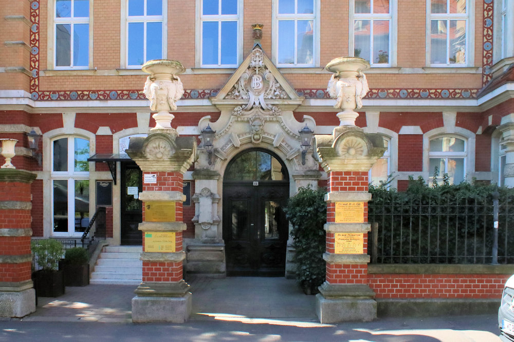 - Klinker-Putz-Fassade, reich gegliedert, Putz-, Terracotta-, Kunst- und Sandsteingliederungen, zur Straße vorspringender Seitenflügel, Zwerchhäuser und Zwerchgiebel, aufwändige Einfriedung