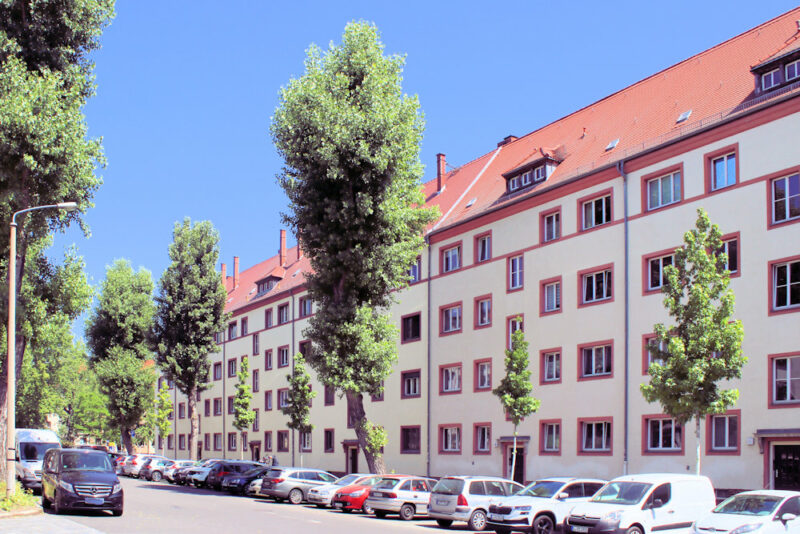 Die Wohnanlage Anhalter Straße 4 bis 12 in Eutritzsch steht nahe dem Nordfriedhof geschlossener Blockrandbebauung.