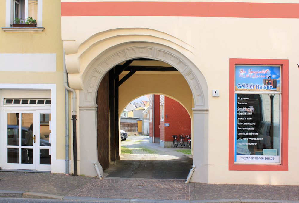 Putzfassade, zurückgesetzte, rundbogige Durchfahrt, Ohrenfaschenportal mit gesprengtem Giebel und Wappen