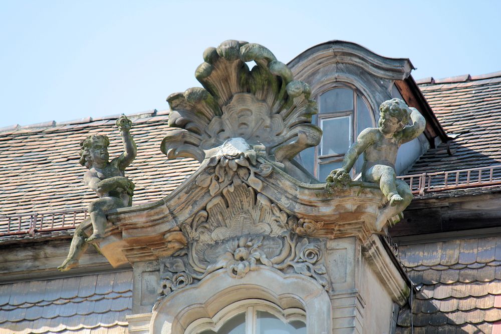 - Putzfassade, Portal mit Wellengiebel und zwei Figuren, Putzspiegel, Betonung der Mittelachse durch Fensterverdachungen, reich bekrönte Mittelgaube