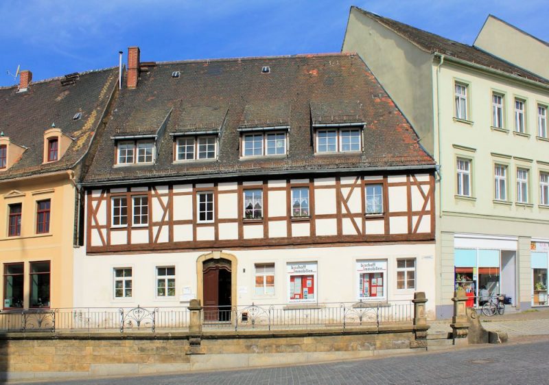 Das Gebäude Liegenbank 1 in Wurzen steht zwischen Markt und Schloss in Blockrandbebauung.