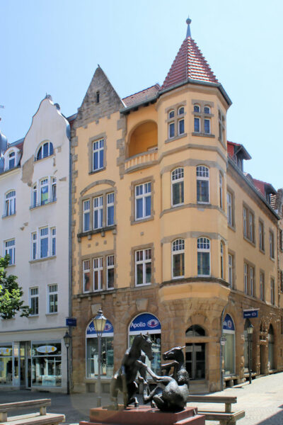 Das Wohn- und Geschäftshaus Roßmarkt 5 zwischen der Michaeliskirche und dem Goethepark in Zeitz in geschlossener Blockrandbebauung.