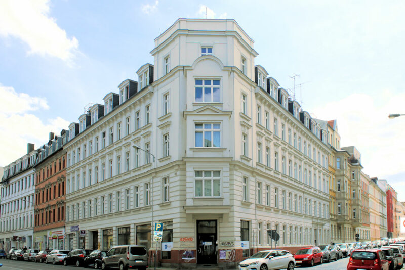 Das Wohnhaus Zweinaundorfer Straße 2 in Anger-Crottendorf steht geschlossener Blockrandbebauung zwischen der Riebeckstraße und dem S-Bahnhof Anger-Crottendorf.
