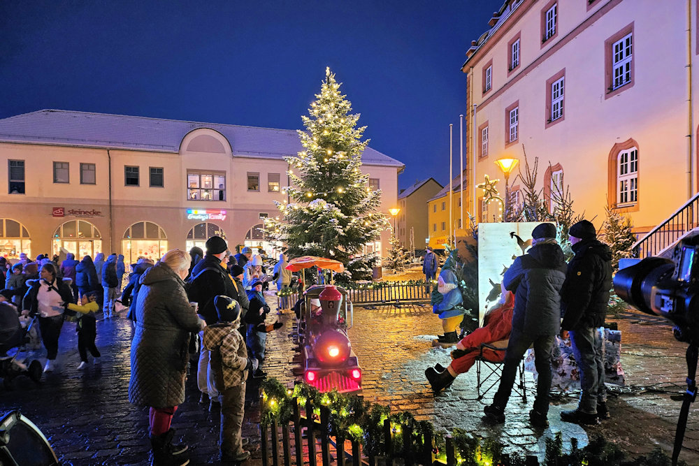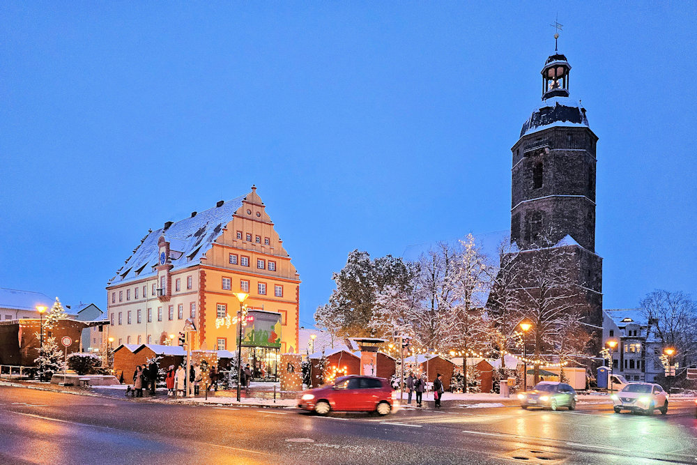 Klein aber fein – so ist der Weihnachtsmarkt in Eilenburg. Zwischen Rathaus und Nikolaikirche reihen sich die Buden mit Glühwein, handgemachten, regionalen Produkten und süßen und herzhaften Leckereien. Vor dem Rathaus fährt eine Eisenbahn für die Kinder.