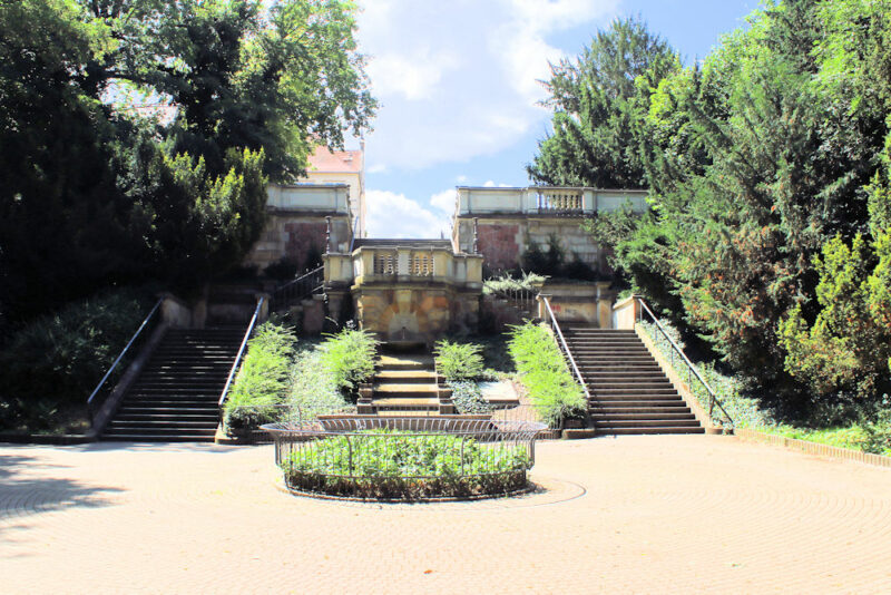 - repräsentative Treppenanlage vom Rathausplatz zum Stadtpark, einläufige Treppe zu einem Podest, dann zweiläufige Treppe zum Stadtpark mit Brunnenbecken