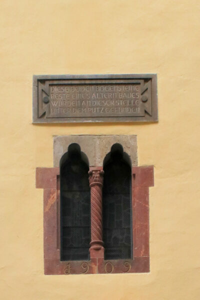 - Diese beiden Bogensteine / Reste eines altern Baues / wurden an dieser Stelle / unter dem Putz gefunden