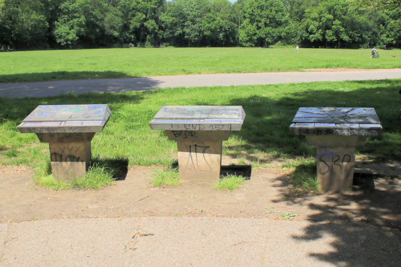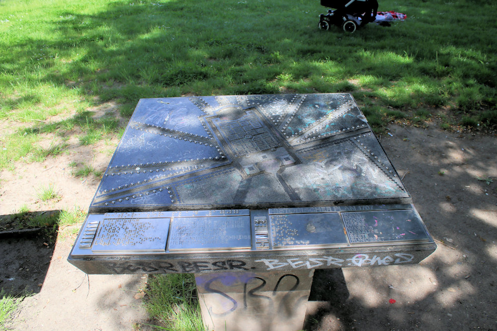 Der Blindenpark im Rosental in Leipzig befindet sich in der Mitte der großen Wiese, erhalten blieben nur drei Informationstafeln