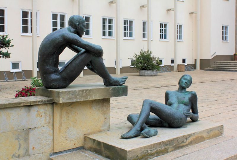 Die Bronzeplastik „Paar“ in Chemnitz steht am Zugang des Stadtbades.