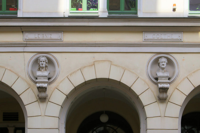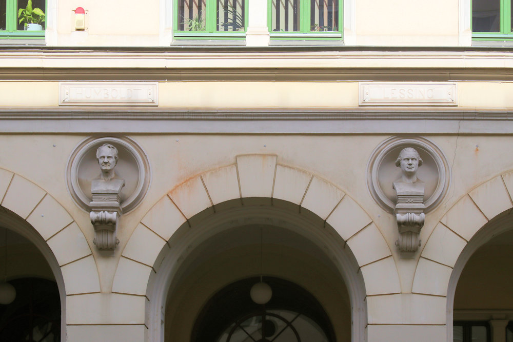 Büsten für Leibniz, Goethe, Humboldt und Lessing an der Schule am Floßplatz in Leipzig