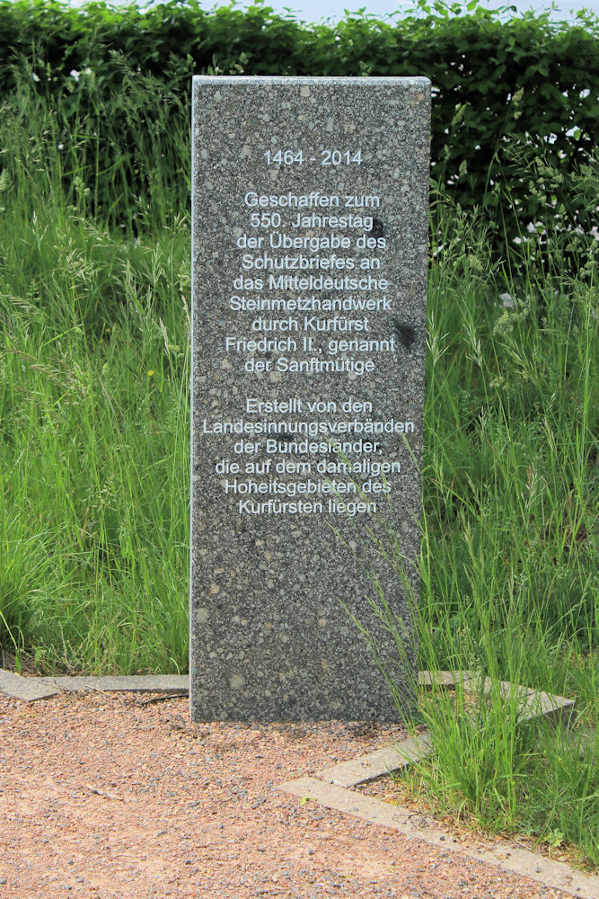 1464 – 2014 / Geschaffen zum / 550. Jahrestag der Übergabe des / Schutzbriefes an / das Mitteldeutsche / Steinmetzhandwerk / durch Kurfürst / Friedrich II., genannt / der Sanftmütige.