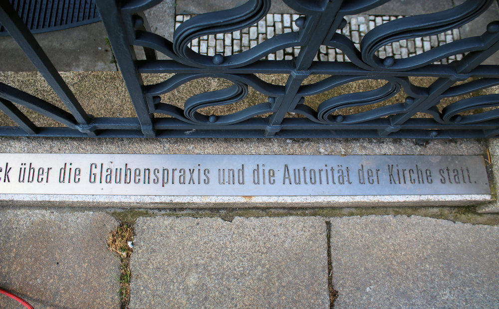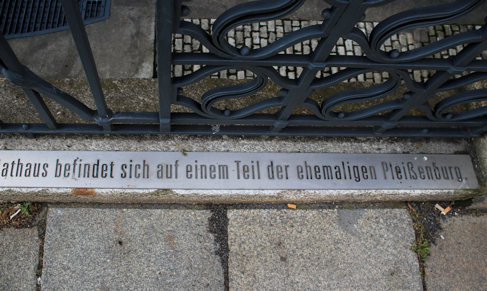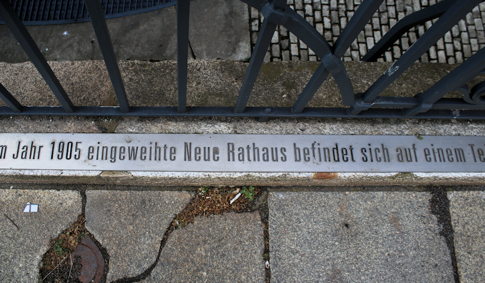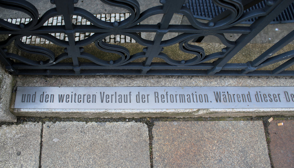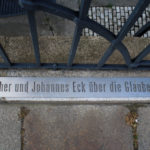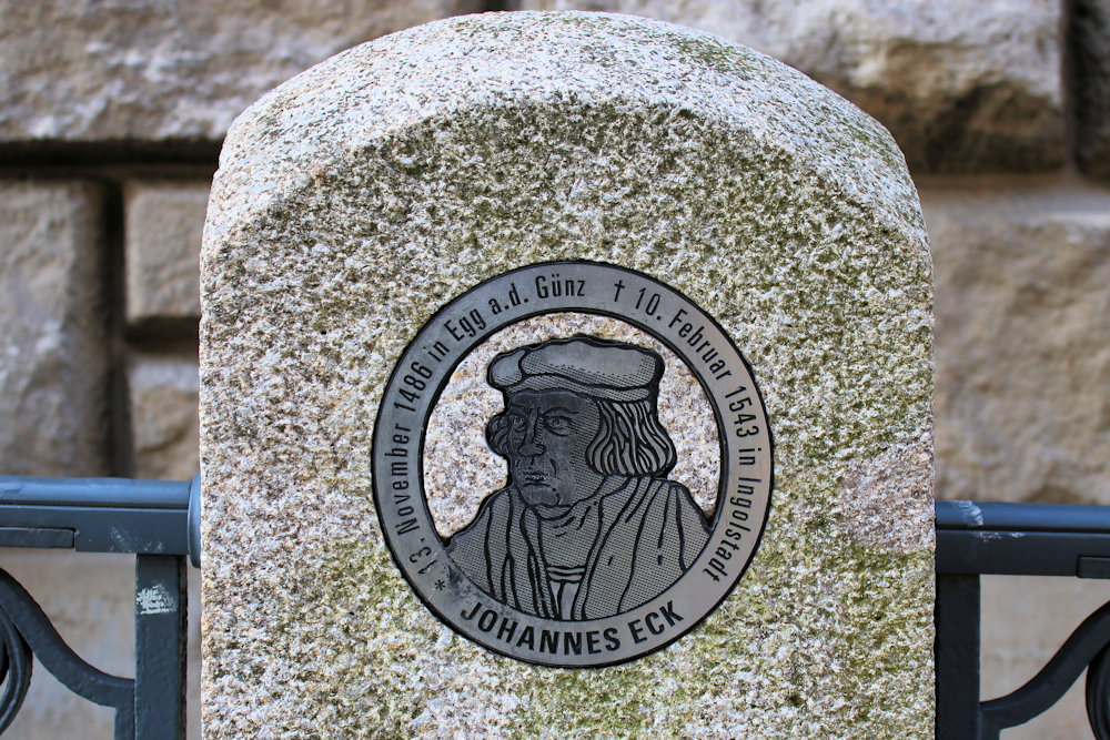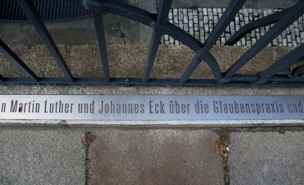 - in zwei Einfriedungspfeiler eingelassene Bildnismedaillons von Dr. Martin Luther und Dr. Johannes Eck, auf der Oberseite des Kellerlichtschachtes des Ratskellers eingelassenes Band mit Inschrift