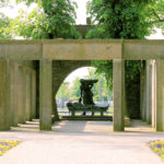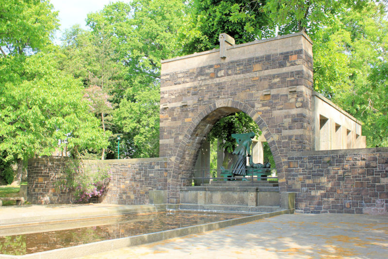 - heroische Pfeiler- und Mauerarchitektur mit Bronzegruppe eines aufgebahrten Soldaten und einer trauernden Frau, davor Wasserbecken