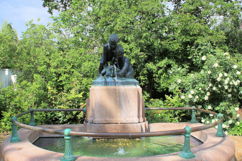 - halbrundes Brunnenbecken, Postament mit Figur zweier Knaben und eines Frosches