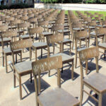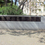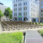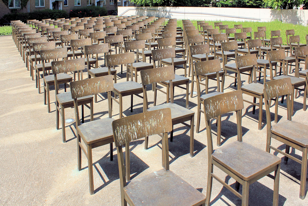 - Nachzeichnung des Grundrisses der Synagoge auf einer Fläche von 12 x 12 Metern mit Betonmauern, innen Feld aus 140 leeren Bronzestühlen