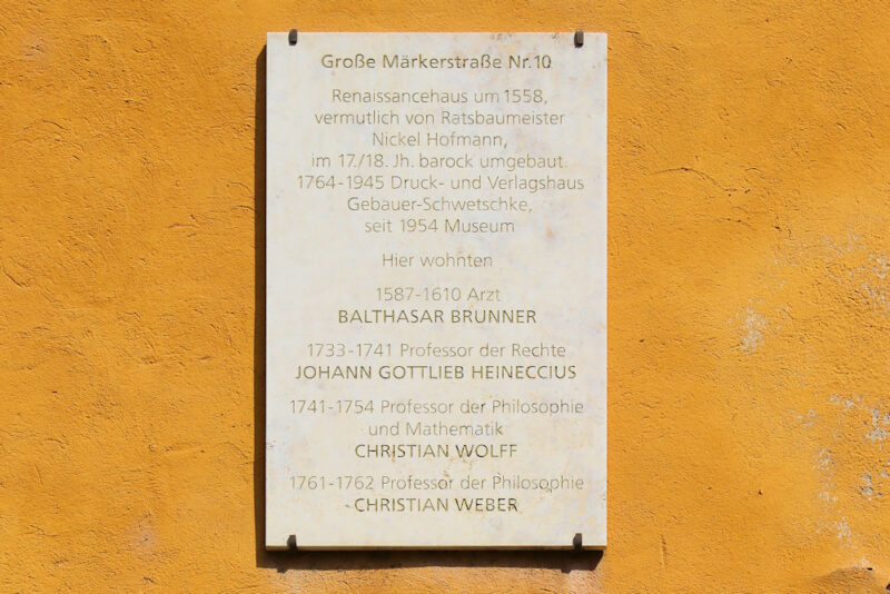 - Große Märkerstraße Nr. 10 / Renaissancehaus um 1558 / vermutlich vom Ratsbaumeister / Nickel Hofmann, / im 17./18. Jh. barock umgebaut. /1764 – 1945 Druck- und Verlagshaus /Gebauer-Schwetschke, / seit 1954 Museum / Hier wohnten / 1587 – 1610 Arzt / Balthasar Brunner / 1733 – 1741 Professor der Rechte / Johann Gottlieb Heineccius / 1741 – 1754 Professor der Philosophie / und Mathematik / Christian Wolff / 1761 – 1762 Professor der Philosophie / Christian Weber