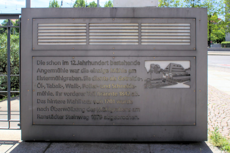 Die Erinnerungstafel für die Angermühle befindet sich an der Jacobstraße, Ecke Ranstädter Steinweg am Treppenabgang zum Elstermühlgraben.