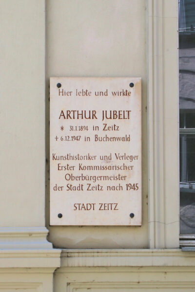 - Hier lebte und wirkte / Arthur Jubelt / * 31.1.1894 in Zeitz / + 6.12.1947 in Buchenwald / Kunsthistoriker und Verleger / Erster Kommissarischer Oberbürgermeister / der Stadt Zeitz nach 1945 / Stadt Zeitz