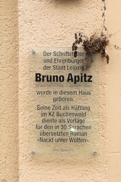 - Der Schriftsteller / und Ehrenbürger / der Stadt Leipzig / Bruno Apitz / (28. April 1900 in Leipzig – 7. April 1979 in Berlin) / wurde in diesem Haus / geboren. / Seine Zeit als Häftling / im KZ Buchenwald / diente als Vorlage / für den 30 Sprachen / übersetzten Roman / „Nackt unter Wölfen“ / Stadt Leipzig 2015