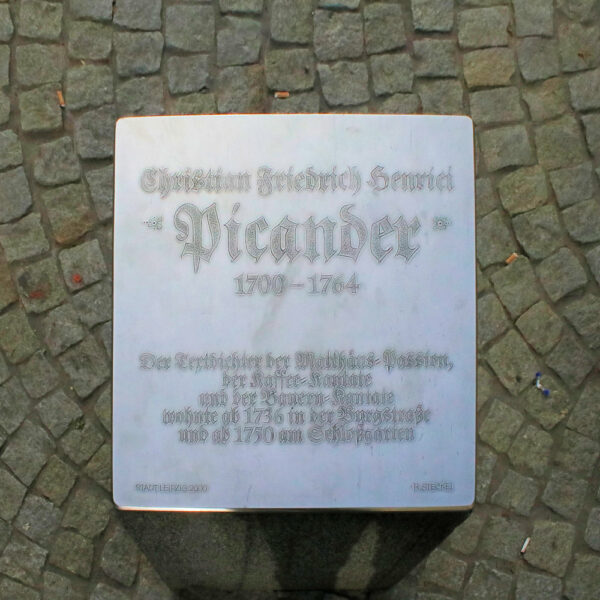 - Christian Friedrich Henrici / Picander / 1700 – 1764 / Der Textdichter der Matthäus-Passion, / der Kaffee-Kantate / und der Bauern-Kantate /wohnte ab 1736 in der Burgstraße / und ab 1750 am Schlossgarten