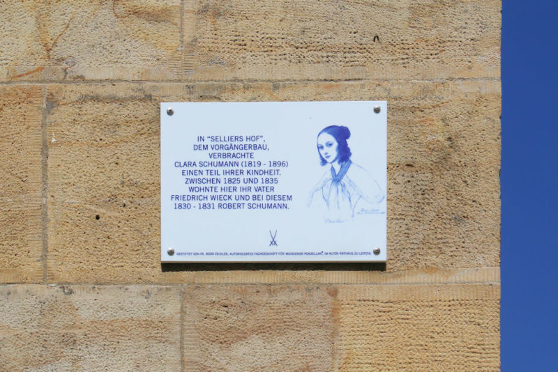 einen Teil ihrer Kindheit. / Zwischen 1825 und 1835 / wohnte hier ihr Vater / Friedrich Wieck und bei diesem / 1830 – 1831 Robert Schumann.Gestiftet von Fa. Bodo Zeidler, Autorisiertes Fachgeschäft für Meissener Porzellan im Alten Rathaus zu Leipzig
