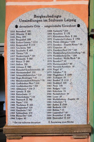 - Granittafel mit Auflistung der devastierten Orte im Südraum Leipzig, Angabe der umgesiedelten Einwohner, Zeichen für abgebrochene Kirche
