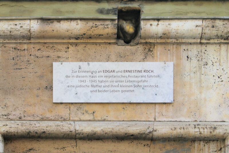 - Zur Erinnerung an Edgar und Ernestine Koch, / die in diesem Haus ein vegetarisches Restaurant führten. / 1943 – 1945 haben sie unter Lebensgefahr / eine jüdische Mutter und ihren kleinen Sohn versteckt / und beider Leben gerettet.