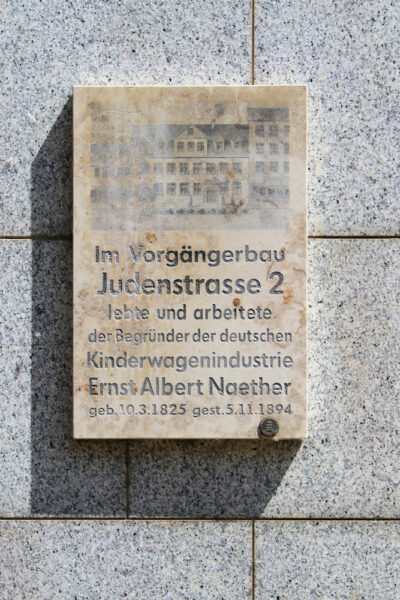- Im Vorgängerbau / Judenstraße 2 / lebte und arbeitete / der Begründer der deutschen / Kinderwagenindustrie / Ernst Albert Naether / geb. 10.3.1825 gest. 5.11.1894