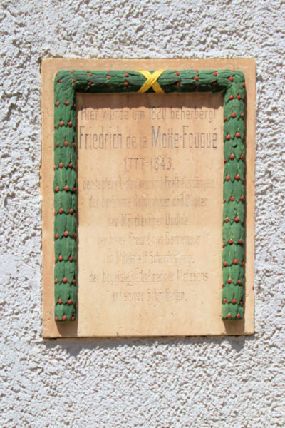 - Hier wurde um 1820 beherbergt / Friedrich de la Motte-Fouqué / 1777-1843 / der tapfere Lützower und Freiheitssänger / der berühmte Romantiker und Dichter / der Märchenoper Undine / der treue Freund von Barromäus / von Miltitz auf Scharfenberg / der begeisterte Lobredner Meissens / und seiner Schönheiten.