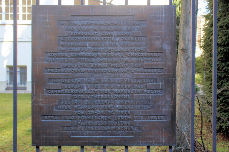 Die Gedenktafel für das Generalkonsulat der Republik Polen befindet sich am Zaun der Villa Ury in der Wächterstraße im Musikviertel in Leipzig.