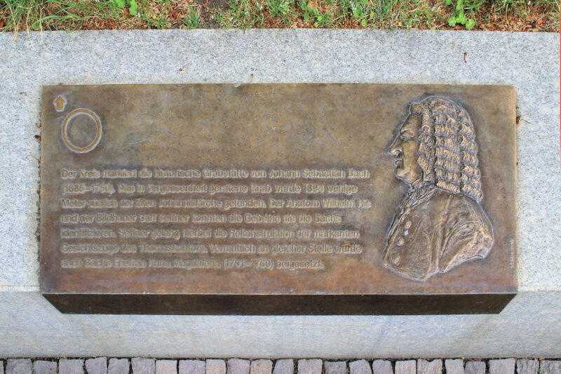 Der Kreis markiert die historische Grabstätte von Johann Sebastian Bach / (1685 bis 1750). Das in Vergessenheit geratene Grab wurde 1894 wenige / Meter südlich der alten Johanniskirche gefunden. Der Anatom Wilhelm His / und der Bildhauer Carl Seffner konnten die Gebeine als die Bachs / identifizieren. Seffner gelang hierbei die Rekonstruktion der markanten / Gesichtszüge des Thomaskantors. Vermutlich an gleicher Stelle wurde/ auch Bachs Ehefrau Anna Magdalena (1701 – 1760) beigesetzt.