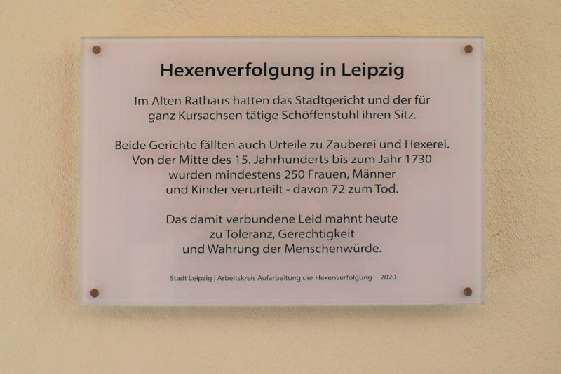 - Die Gedenktafel für die Hexenverfolgung in Leipzig kann besichtigt werden.