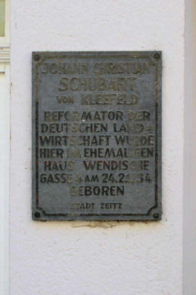 - Johann Christian / Schubart / von Kleefeld / Reformator der / deutschen Land = / wirtschaft wurde / hier im ehemaligen / Haus Wendische / Gasse 4 am 24,2.1734 / geboren / Stadt Zeitz
