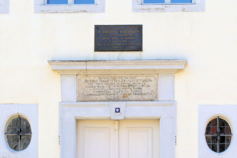 - Hier wohnte, wirkte und starb / Dr. Johannes Bugenhagen / Gen. Sup. des Kurkreises / Geb. zu Wollin in Pommern / D. 24 Juny 1485 / Gest. in Wittenberg D. 20. April 1558 / Hebr. 13, 7