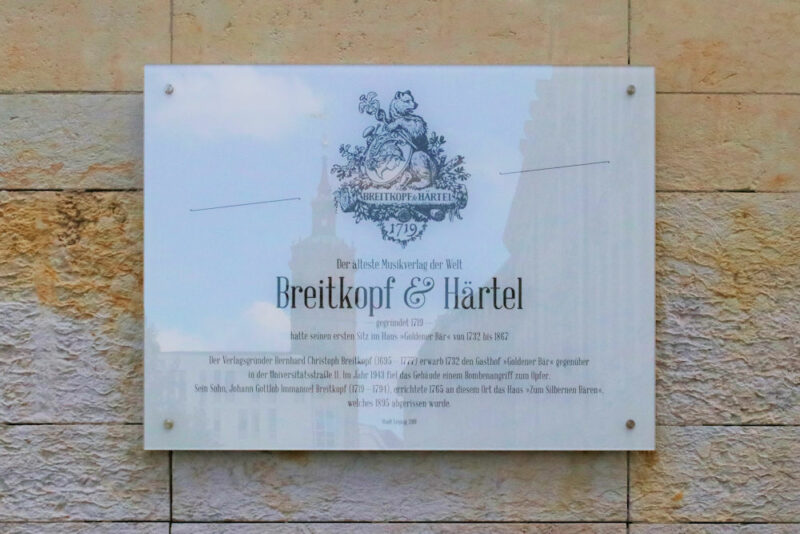 Die Gedenktafel für den Musikverlag Breitkopf & Härtel befindet sich am Wohnhaus Universitätsstraße 18 in der Innenstadt von Leipzig.
