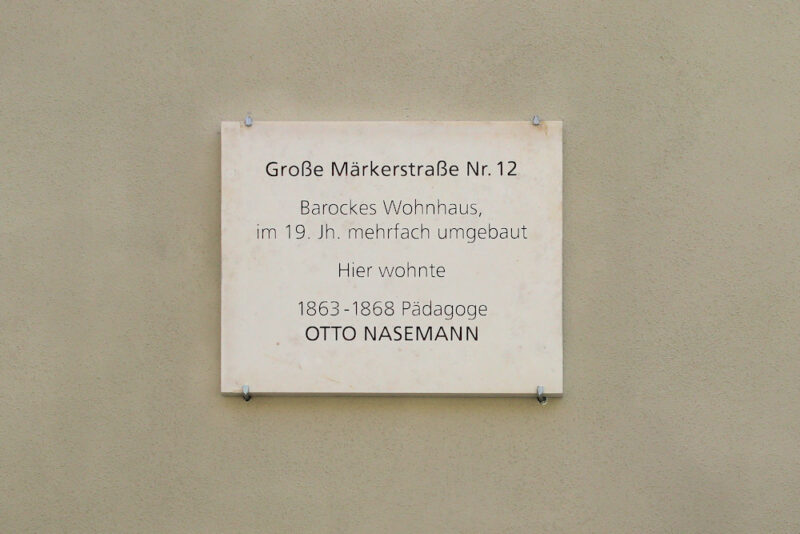 - Große Märkerstraße 12 / Barockes Wohnhaus, / im 19. Jh. Mehrfach umgebaut / Hier wohnte / 1863 – 1868 Pädagoge / Otto Nasemann