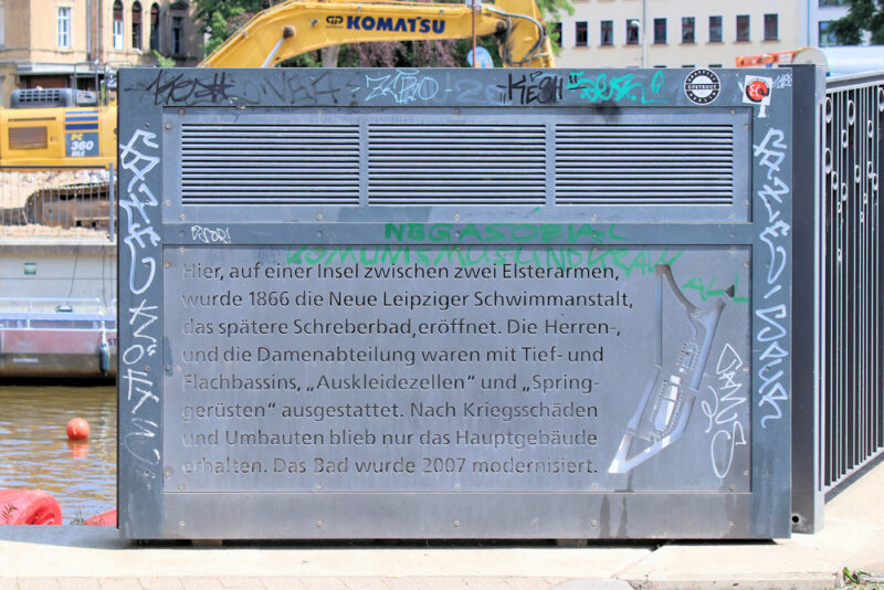 - Hier, auf einer Insel zwischen zwei Elsterarmen, / wurde 1866 die Neue Leipziger Schwimmanstalt, / das spätere Schreberbad, eröffnet. Die Herren-, / und die Damenabteilung waren mit Tief- und / Flachbassins, „Auskleidehallen“ und „Spring- / gerüsten“ ausgestattet. Nach Kriegsschäden / und Umbauten blieb nur das Hauptgebäude / erhalten. Das Bad wurde 2007 modernisiert.