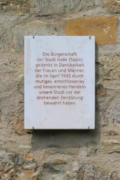 - Die Bürgerschaft / der Stadt Halle (Saale) / gedenkt in Dankbarkeit / der Frauen und Männer / die im April 1945 durch / mutiges, entschlossenes / und besonnenes Handeln / unsere Stadt vor der / Zerstörung / bewahrt haben.