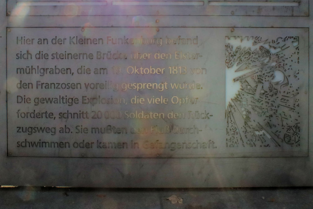 Hier an der Kleinen Funkenburg befand / sich die steinerne Brücke über den Elster- / mühlgraben, die am 19. Oktober 1813 von / den Franzosen voreilig gesprengt wurde. / Die gewaltige Explosion, die viele Opfer / forderte, schnitt 20 000 Soldaten den Rück- / zugsweg ab. Sie mussten den Fluss durch- / schwimmen oder kamen in Gefangenschaft.Gedenktafel Haus „Zum Blauen Lamm“