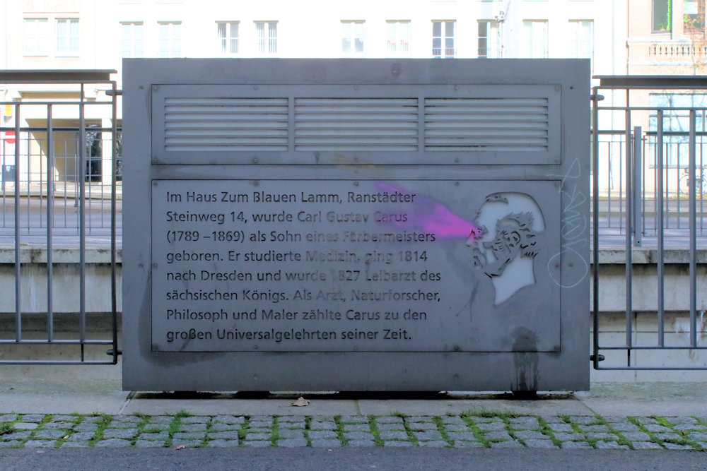 Im Haus Zum Blauen Lamm, Ranstädter / Steinweg 14, wurde Carl Gustav Carus / (1789 – 1869) als Sohn eines Färbermeisters / geboren. Er studierte Medizin, ging 1814 / nach Dresden und wurde 1827 Leibarzt des / sächsischen Königs. Als Arzt, Naturforscher, / Philosoph und Maler zählte Carus zu den / großen Universalgelehrten seiner Zeit.Gedenktafel Wohnhaus Wagner: