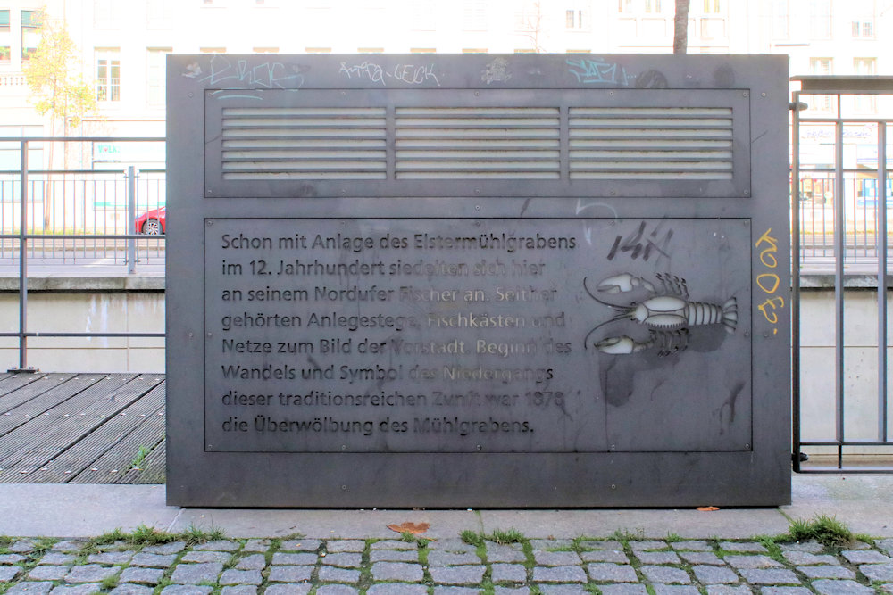 Schon mit Anlage des Elstermühlgrabens / im 12. Jahrhundert, siedelten sich hier / an seinem Nordufer Fischer an. Seither / gehörten Anlegestege, Fischkästen und / Netze zum Bild der Nordstadt. Beginn des / Wandels und Symbol des Niedergangs / dieser traditionsreichen Zunft war 1878 /die Überwölbung des Mühlgrabens.Gedenktafel Goldene Laute