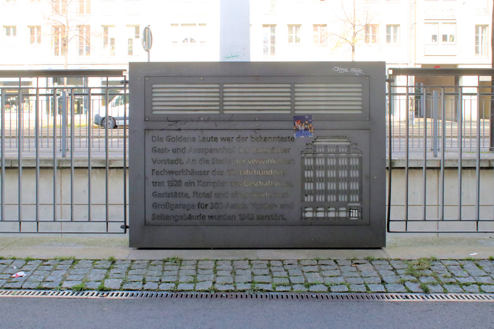 Die Goldene Laute war der bekannteste / Gast- und Ausspannhof der Ranstädter / Vorstadt. An die Stelle der verwinkelten / Fachwerkhäuser des 18. Jahrhunderts / trat 1928 ein Komplex aus Geschäftshaus / Gaststätte, Hotel und einer modernen / Großgarage für 300 Autos, Vorder- und / Seitengebäude wurden 1943 zerstört.Gedenktafel Jacobskirche: