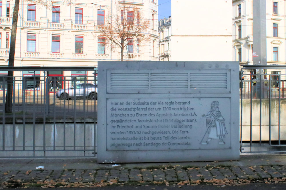 Hier an der Südseite der Via Regia bestand / die Vorstadtpfarrei der um 1200 von irischen / Mönchen zu Ehren des Apostels Jacobus d.Ä. / gegründeten Jacobskirche (1544 abgerissen) / Ihr Friedhof und Spuren früher Besiedlung / wurden 1951/52 nachgewiesen. Die Fern- / handelsstraße ist bis heute Teil des Jacobs- / pilgerwegs nach Santiago de Compostela.