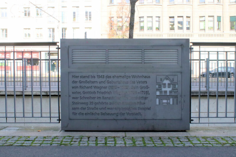 Hier stand bis 1943 das ehemalige Wohnhaus / der Großeltern und Geburtshaus des Vaters / von Richard Wagner (1813 – 1883). Sein Groß- / vater Gottlob Friedrich Wagner (1736 – 1795), / war Schreiber im Ranstädter Tor. Ranstädter / Steinweg 39 gehörte zu den ältesten Häu- / sern der Straße und war ein typisches Beispiel / für die einfache Bebauung der Vorstadt.Gedenktafel Fischer: