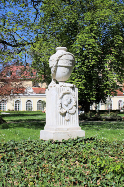 - kanneliertes Postament mit Lorbeergirlande und Bildnismedaillons von Christian Fürchtegott Gellert und Johann Georg Sulzer, darauf eine Urne