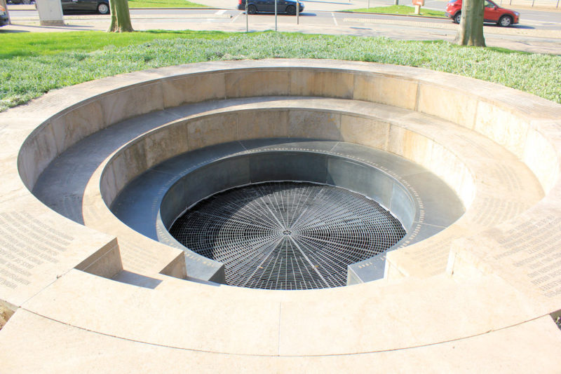 in den Boden treppenförmig abgetiefter Schacht mit Glocke, auf den Stufen Zitate Goerdelers