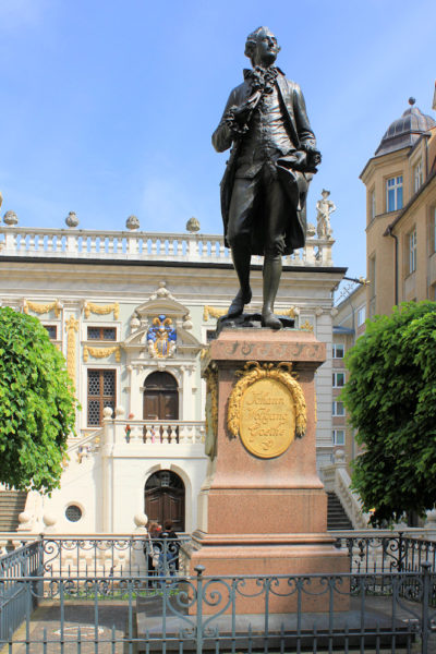 Das Goethe-Denkmal befindet sich auf dem Naschmarkt vor der Alten Handelsbörse hinter dem Alten Rathaus in Leipzig.