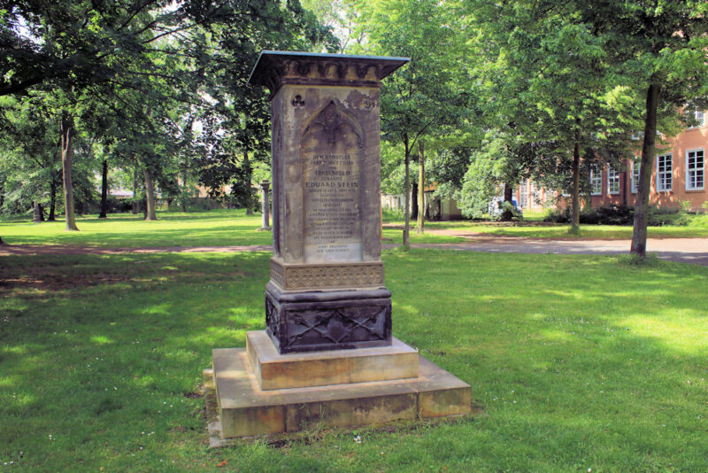 - Dem Künstler / Franz Matthias / von / Treuenfeld / genannt / Eduard Stein / geb. am IX. April MDCCXCIV / in Austerlitz / von seinen Freunden / geweiht / Er war Mitglied des / Leipziger Stadt-Theaters / seit der Begründung desselben / unter Küstners Leitung / im August MDCCCXVII / bis zu deren Schlusse / mit welchem sich auch / am / X. May MDCCCXXVIII / sein Leben wendete