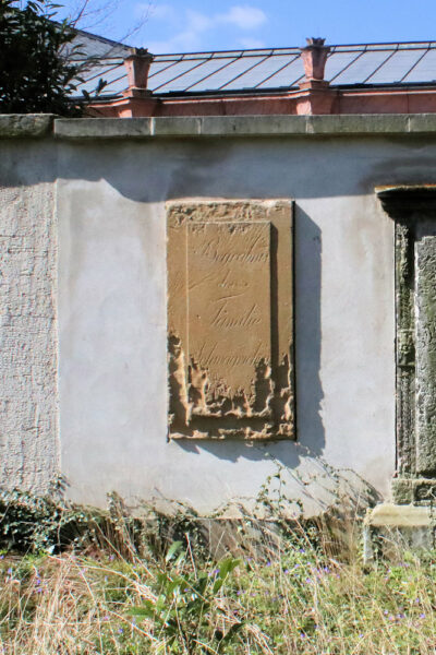 - Grabplatte mit vertiefter Inschrift, in die Friedhofsmauer eingelassen