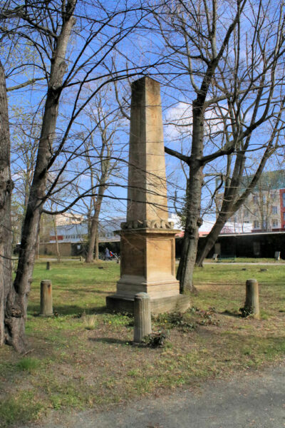 - Obelisk auf Postament und Sockel, umgeben von vier niedrigen Säulen