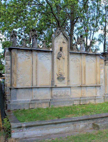 Das Grabmal mit Marienfigur in Jahna steht auf dem Friedhof als Teil der Friedhofsmauer.